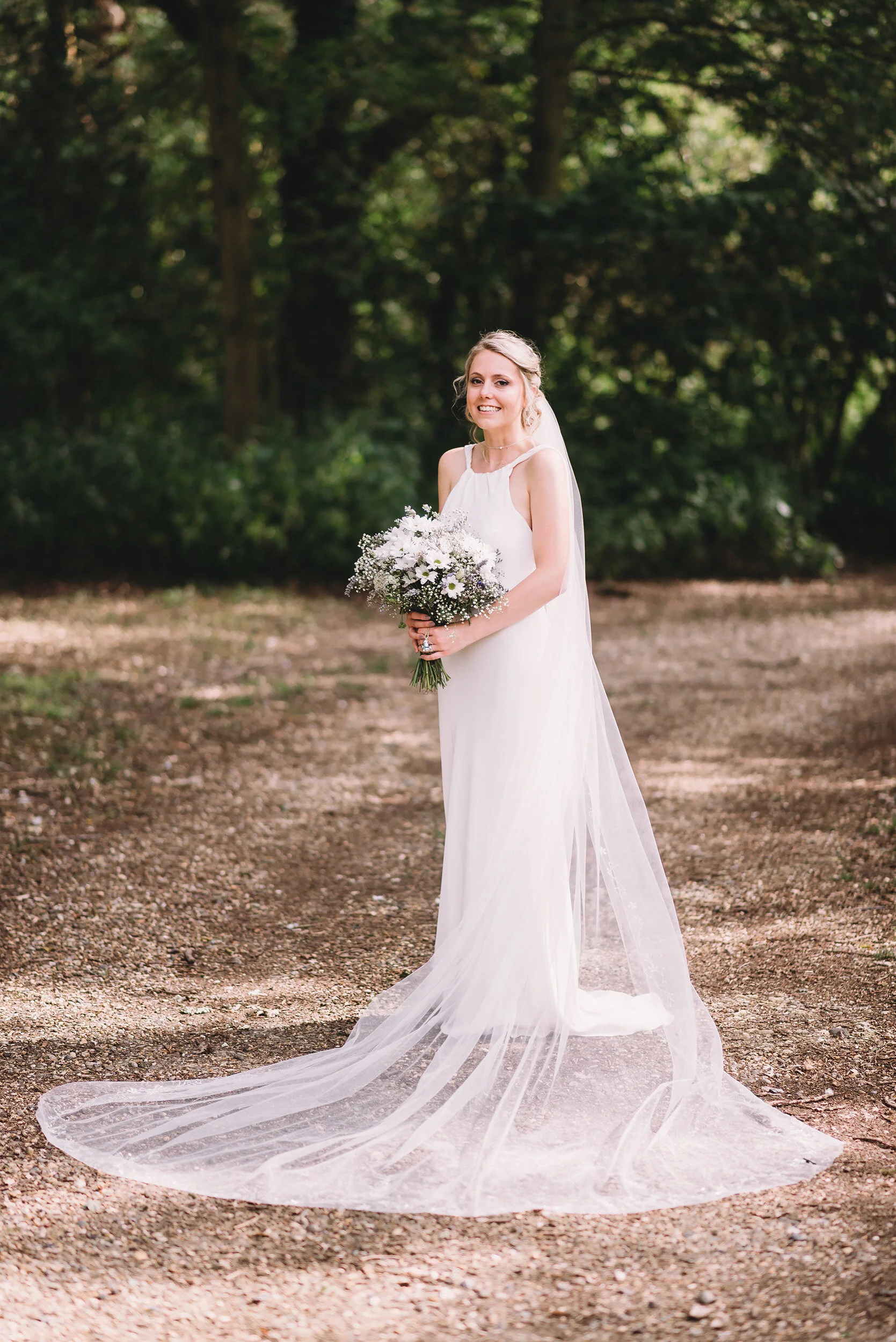 Emma paired her elegant dress with a beaded cathedral-length veil, a Pandora back necklace, and a pair of earrings that her mum wore on her own wedding day. The overall look perfectly complimented her rustic venue, Dove Barn, and the down-to-earth decor she and new husband Richard opted for.