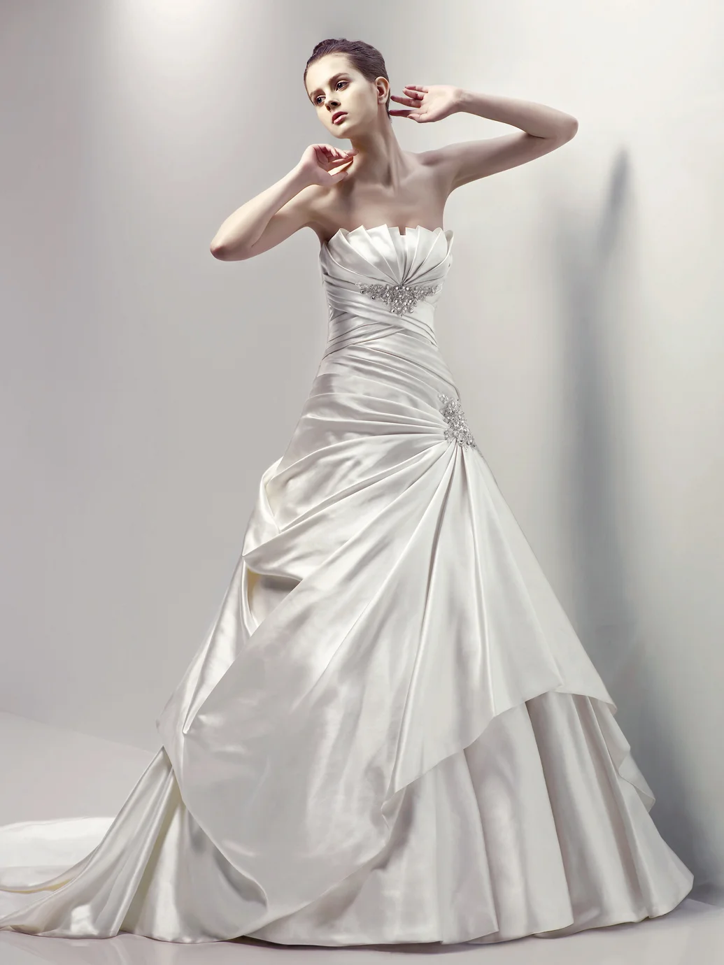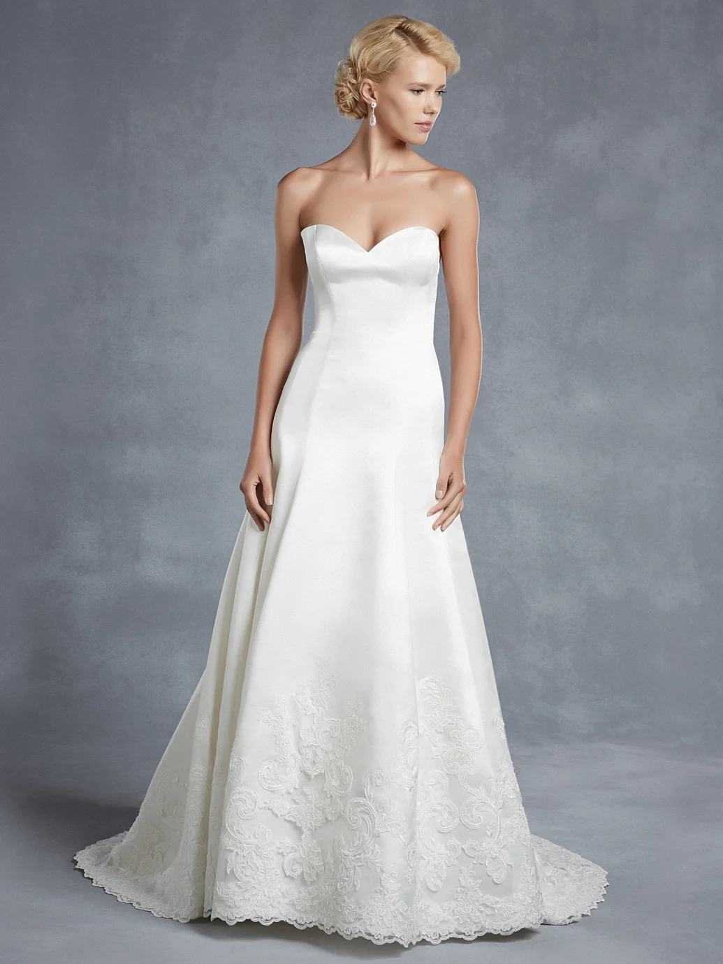 The reason why designers use this cut is because it creates a garment which will closely follow the curves of your body. It also provides a great stretch in the material which again allows the dress to accentuate curves and will drape softly. Many brides love the delicate, graceful flow of a finely made bias cut silk dress.