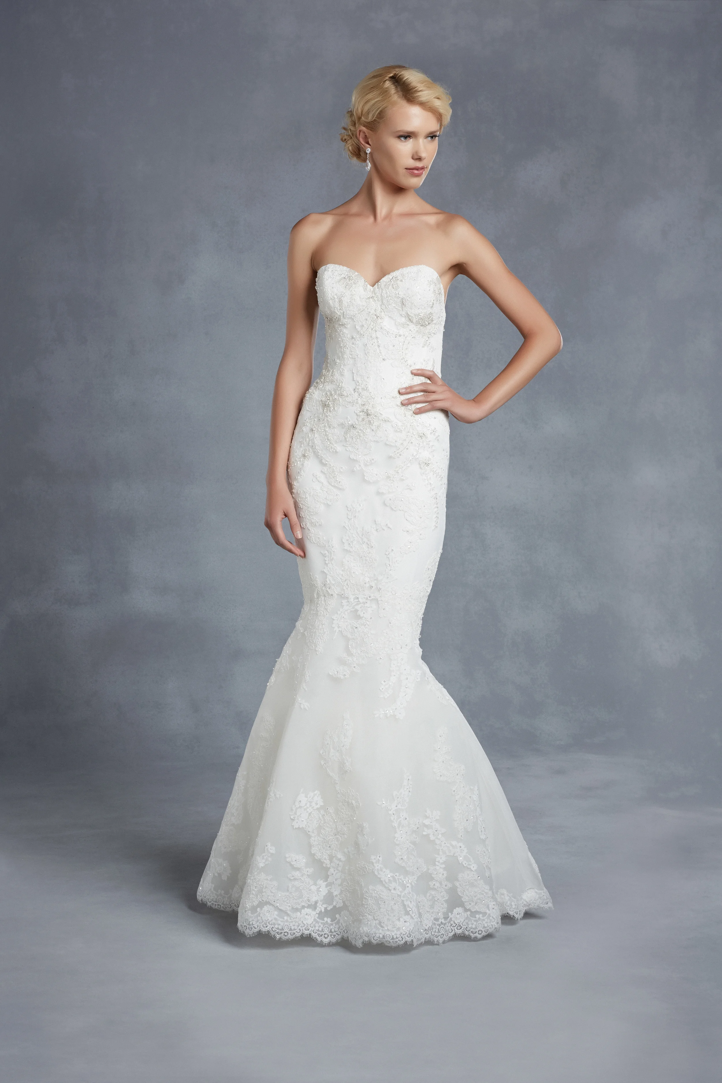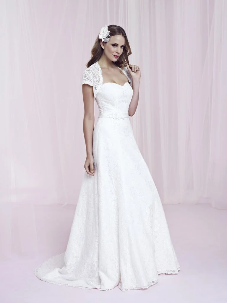 "Lilac" - this is a delightful gown with delicate lace sleeves and gorgeous pearl detailing around the bust. This is a real WOW factor dress.