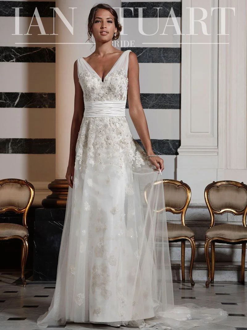 Pracatan has a flattering dropped asymmetric waist line which shows off your figure whilst allowing you to have the full princess skirt. Ian's corsetry is legendary and when you are fitted into this dress you look and feel amazing. The skirt is a wave of silk and tulle/organza with a beautifully long train. The dress is then finished off with beaded decoration on the waist and neckline.